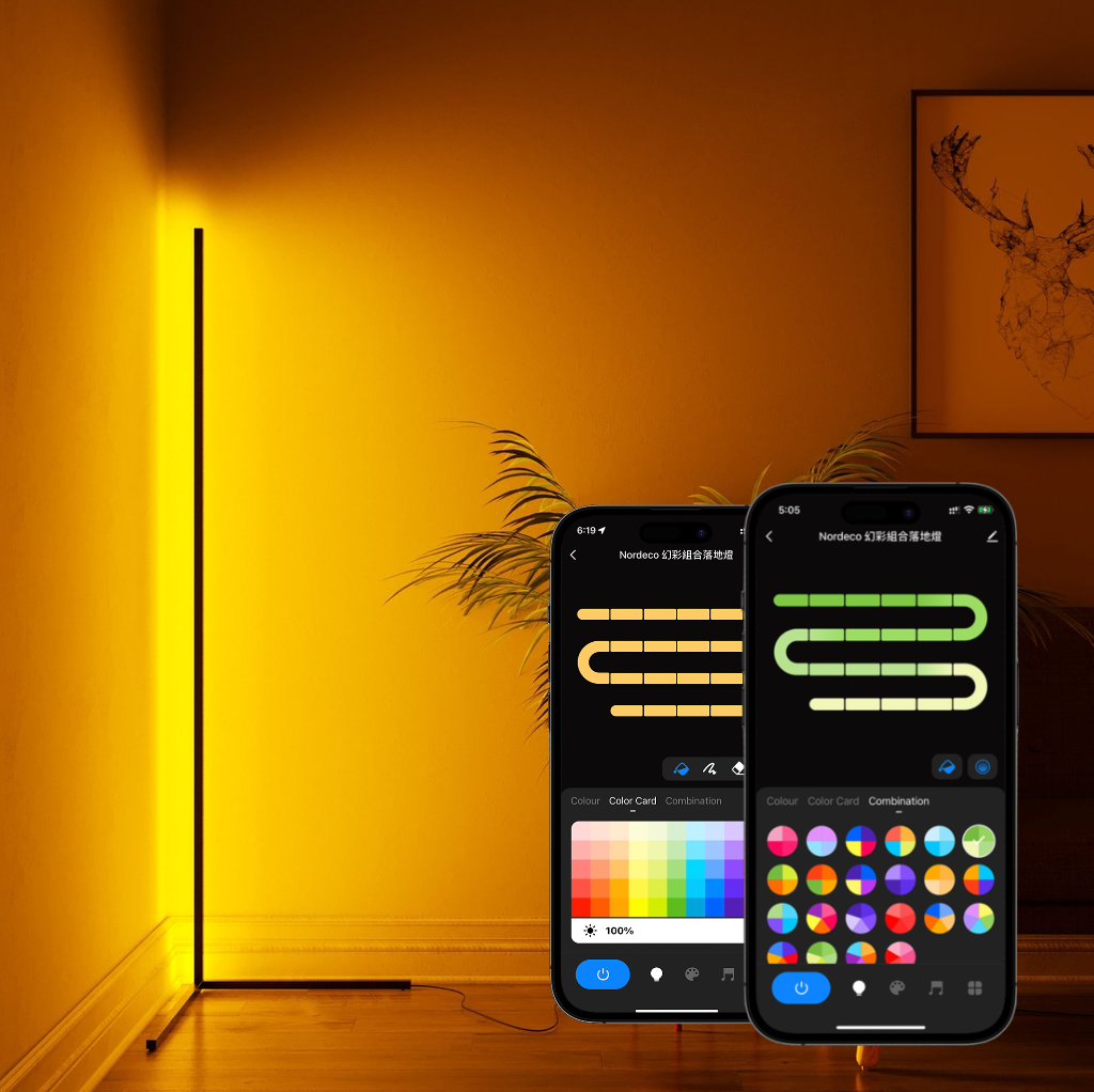 The Symphony combination floor lamp uses the latest RGBIC 2.0 control module. The newly upgraded interface provides more color cards and changes to choose from. You can also set different color combinations to match your home style and mood.