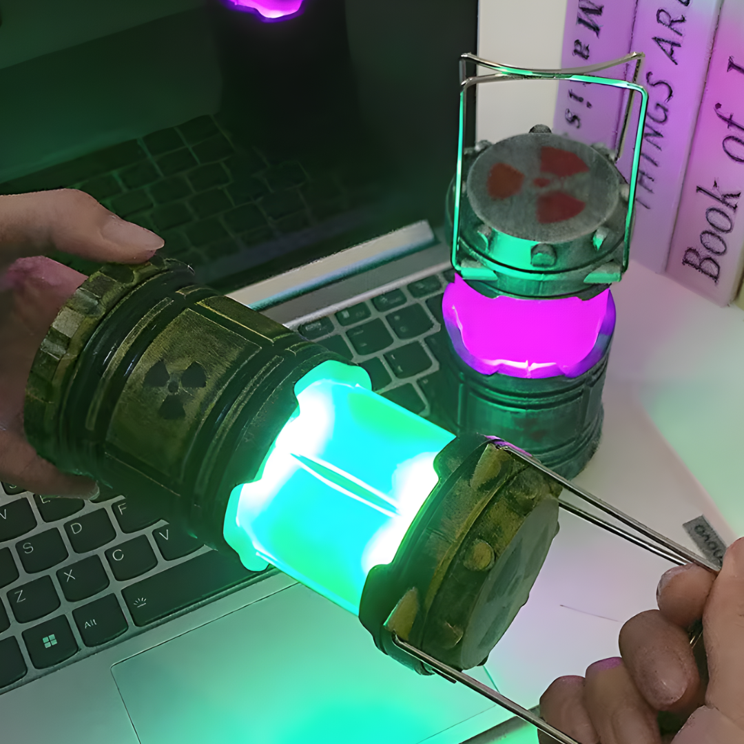 這款露營燈以科幻反應爐為靈感設計,外觀採用金屬舊化質感,頂部印有能量警示符號,像是一顆被封印的能量核心。