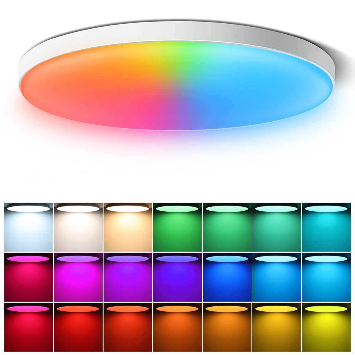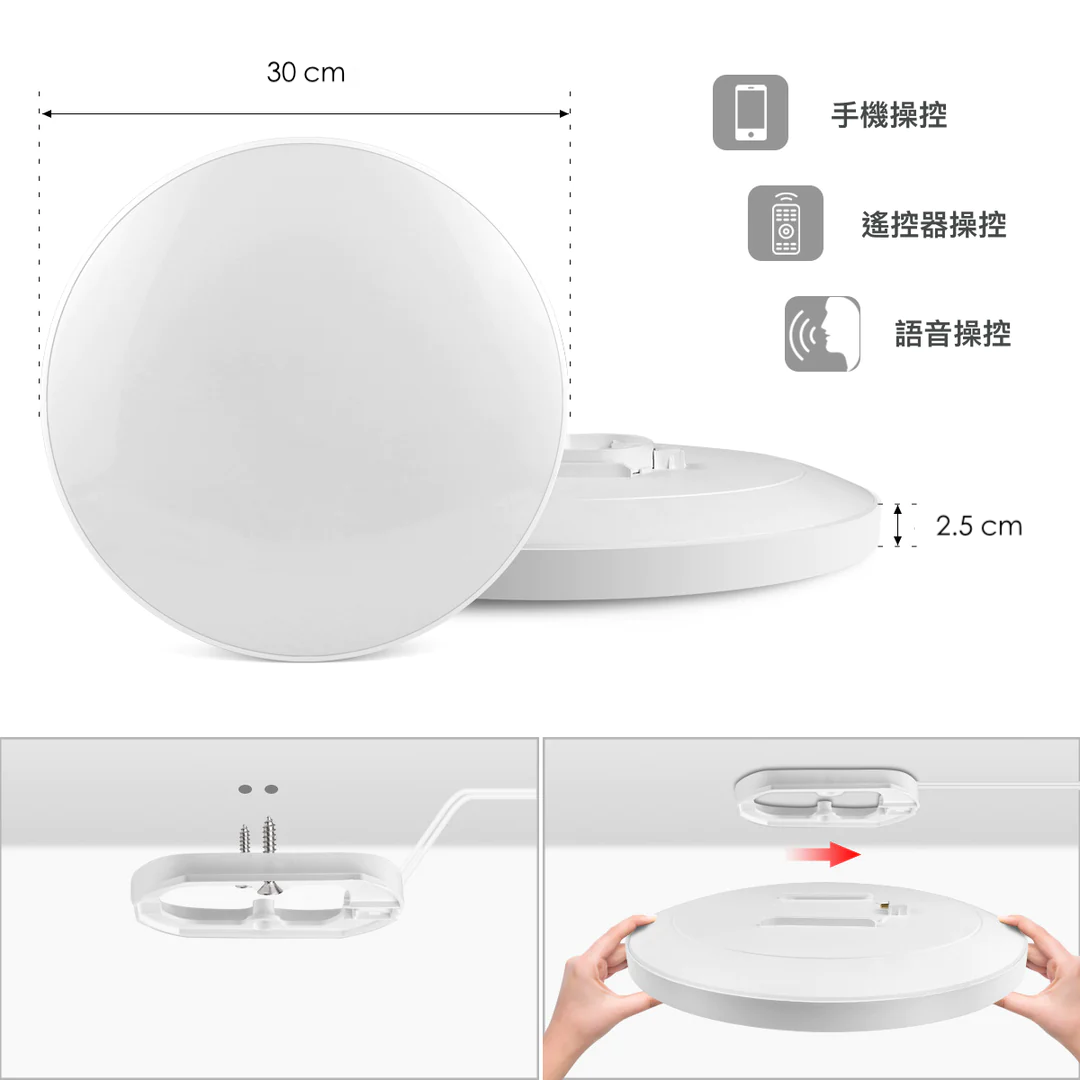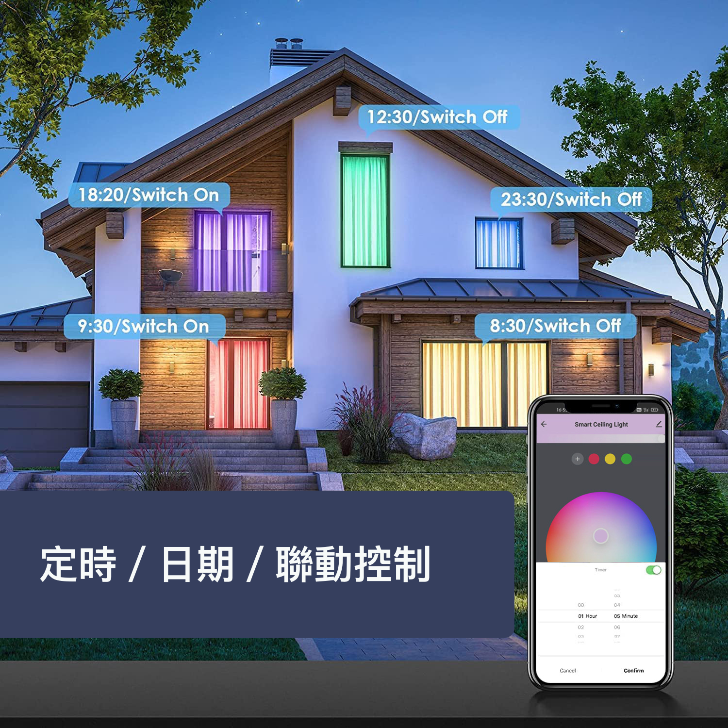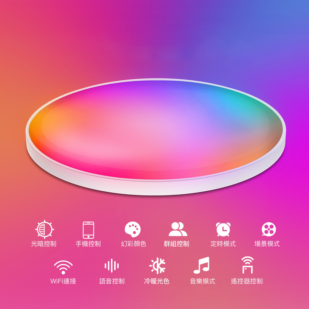 吸頂燈支持暖白光2700 - 6500K色溫與多種幻彩顏色選擇,具有可調光暗功能,通過遙控器和App 可以選擇多種動態模式,例如閃爍,呼吸,頻閃,漸變等,同時您也可以對燈光的亮度及變化的速度進行調整。