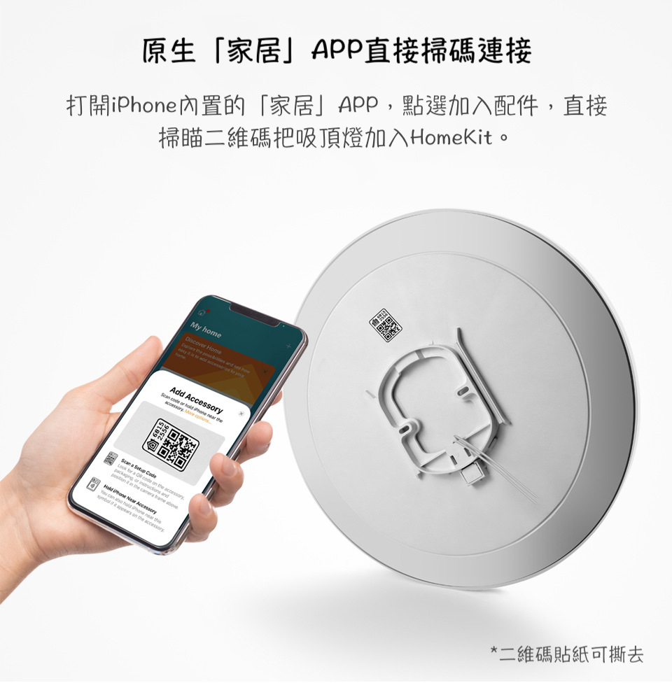 Homekit 智慧LED 吸頂燈現在支持iPhone 家居App控制,支持直接掃碼連接IOS 原生的Homekit 「家居」App,不再需要通過其他第三方APP連接,更加方便快捷。你現在可以使用你的iPhone, iPad, Macbook 等蘋果設備控制你的室內燈光,使用你最喜愛的iPhone 通過原生的Homekit 「家居」App輕鬆操控燈光的顏色、光暗、變化等功能。