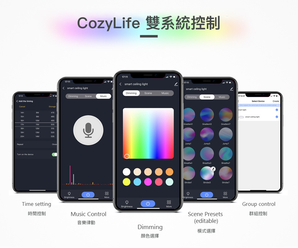 * 由於蘋果並沒有為Homekit開放部份如音樂變化、色彩漸變等功能,所以如果希望使用這些功能需要另外安裝Cozylife App 使用。你可以同步在Homekit及Cozylife App控制。