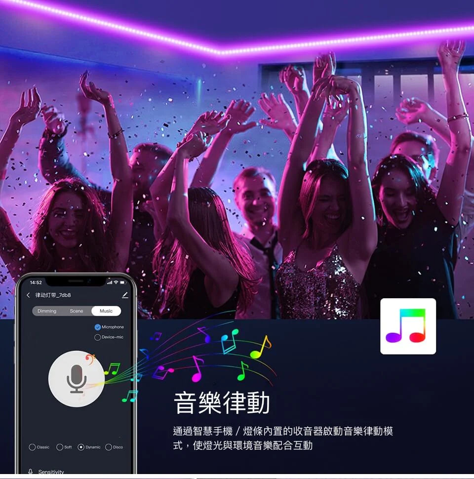 Homekit 變色燈帶可以通過手機的麥克風接收外部音樂的節拍改變燈光的顏色,最適合安放在客廳或電視機的旁邊作配套燈光,同時也是舉行派對的最佳選擇。