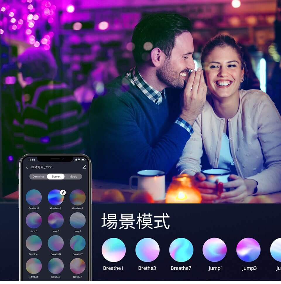 變色燈帶 提供多種單色彩及幻彩可供選擇,具有可調光暗功能,通過附送的搖控/App/ homekit 都 可以選擇多種動態模式,例如閃爍,呼吸,頻閃,漸變等,同時您也可以對燈光的亮度進行調整。