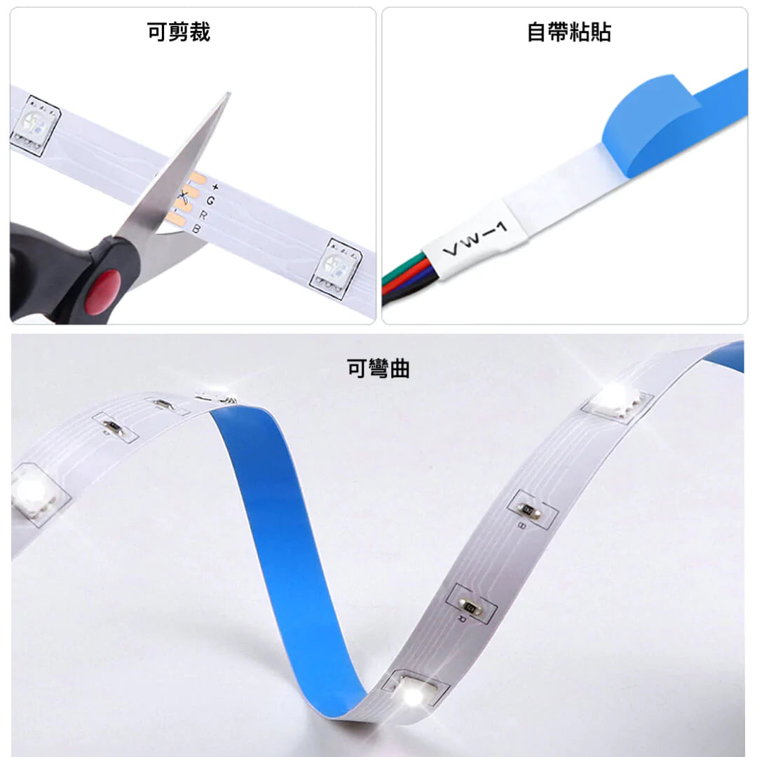 簡易安裝,設備齊全,隨附USB插頭,IR遙控器,控制接收器及RGB 燈帶。只需將膠帶撕下條形燈後面,然後將其粘貼在牆壁或其他表面上,即可固定,超強粘性,易於安裝。您可以輕鬆地將LED燈帶應用到所需的任何光滑位置。