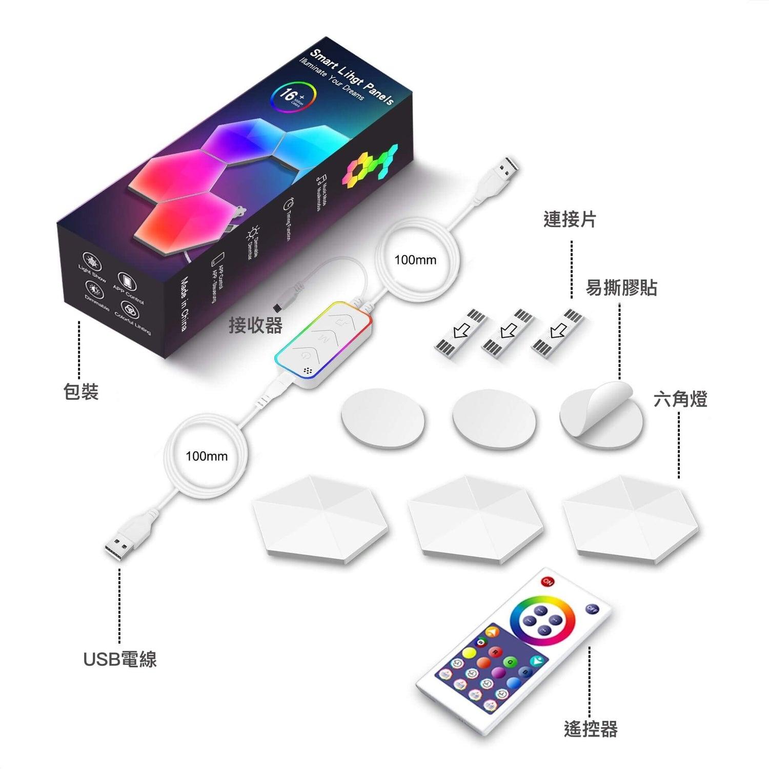 DIY定制您的空間氛圍,我們從積木,拼圖玩具和蜂巢中汲取靈感來設計六角燈,模塊化組件既有趣又富創意。它允許您創建獨特的佈局並顯示您的個性化智能生活。蜂巢牆壁燈擁有多種顏色的靜態和動態色彩模式可選,以適應不同的場景。每個USB電源最多連接20塊光板,你可以通過隨燈附送的易撕膠貼輕易地把六角燈貼在不同的材質上。您可以在床上或沙發上通過應用程序來來調節亮度,顏色及幻彩模式,拼接任何組合來發揮你的創意,輕鬆將牆壁變成藝術品。解放雙手,構建智能家居照明系統。